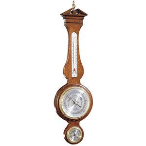 - A thermometer, barometer, and hygrometer are encased in a handsome hardwood frame