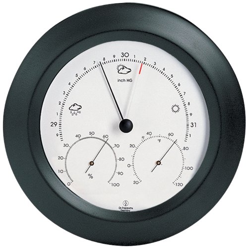 The top dial shows the current barometric pressure with weather forecast symbols and features an adjustable pointer on the barometer gauge to track its changes.